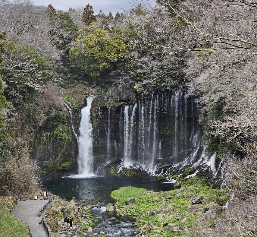 후지 밀크랜드에서 차로 7분 정도 타고 가면 시라이토 폭포에 도착합니다. 시라이토 폭포(白糸の滝)는 용암류의 여러 틈 사이로 나오는 후지산의 지하수가 흰 실(白糸)을 뽑아낸 모습과 같아 보인다는 것에서 이름이 유래된 폭포인데요. 현재 일본의 국가 명승이자 천연기념물로 보호되고 있으며, 2013년에는 후지산의 문화유산의 일부로 세계문화유산에 등록되기도 한 일본의 3대 명폭포입니다. 약 150m 폭에 걸쳐 분출되는 이 폭포는 16-17세기에 후지산을 숭배하는 조직인 후지코의 원조로 일컬어지는 '하세가와 가쿠교'가 수행한 땅으로 알려져 있고, 후지코를 중심으로 한 사람들의 순례와 수행의 장이 되었다고 하네요.