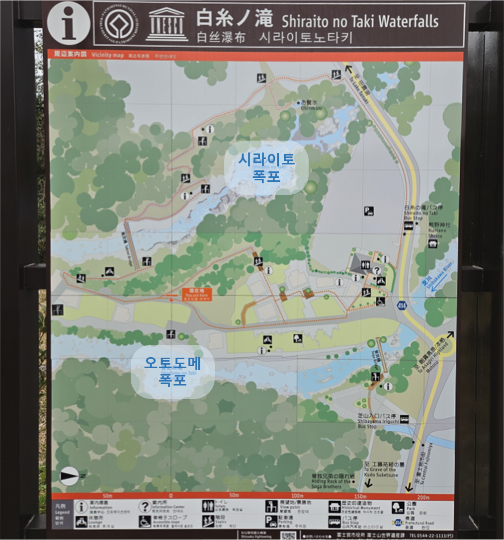 그리고 시라이토 폭포 근처에는 800년 전에 소가 형제가 폭포 근처에서 복수를 위한 상담을 하고 있었을 때 폭포 소리가 시끄러워 이야기를 할 수 없다고 하자 폭포 소리가 멈추었다고 하는 전설이 있는 오토도메(音止の滝) 폭포도 있습니다. 시간이 있다면 두 폭포를 모두 감상할 수 있지만, 저희는 시간이 많지 않았기 때문에 시라이토 폭포만 빠르게 보기로 하였습니다. 아, 여기는 주차가 무료가 아니라서 500엔을 내셔야 하니 참고하세요.