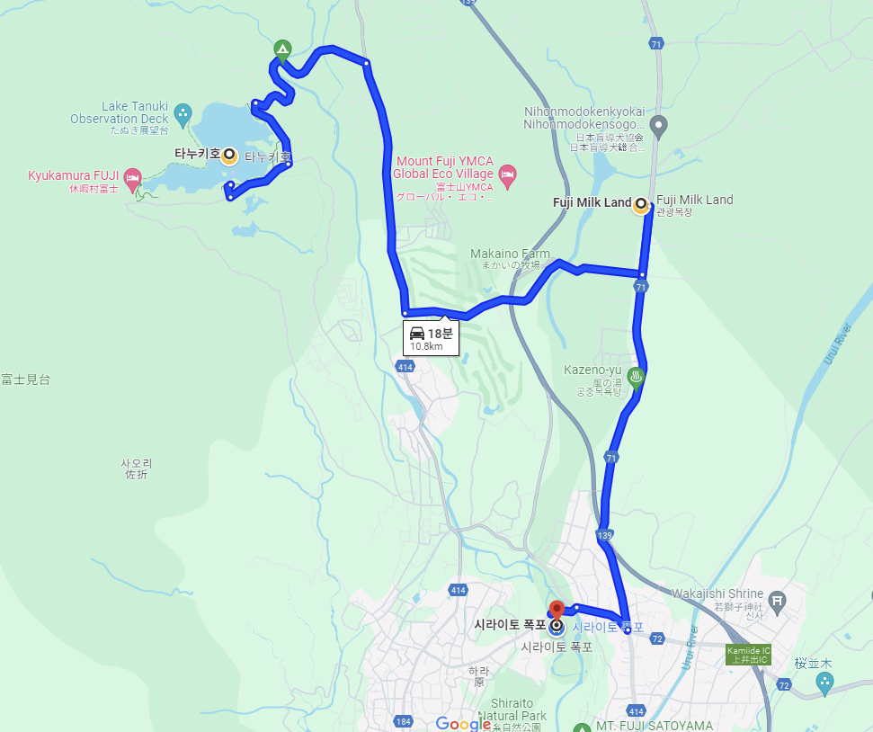 안녕하세요, 시즈오카 후지산 렌터카 여행 3탄입니다. 타누키 호수를 둘러본 후 근처의 후지 밀크랜드와 시라이토 폭포까지 들린 다음 숙소(료칸)로 가는 일정이었는데, 숙소는 이즈 반도(차로 40분 거리)에 있고 체크인 마감 일정이 18:00이어서 부지런히 움직여야 했습니다. 시라이토 폭포에서 16:30분 정도에는 숙소로 떠나는 걸 목표로 했기 때문에, 타누키 호수에서는 15:30쯤 출발하였습니다.