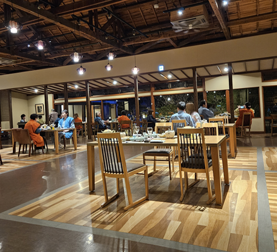 방 구조는 일본식 다다미방이었는데, 깔끔하게 잘 정돈되어 있었습니다. 유카타도 비치되어 있어서 식사를 하러 가거나 온천을 이용할 때 입으면 되어서 편리했습니다. 방에 들어가 짐을 푼 지 얼마 지나지 않아, 석식 먹을 시간이 되어, 유카타로 갈아입고 식당으로 이동했습니다. 예약에 석식과 다음 날 조식이 포함되어 있어서 식사 걱정이 없었습니다.