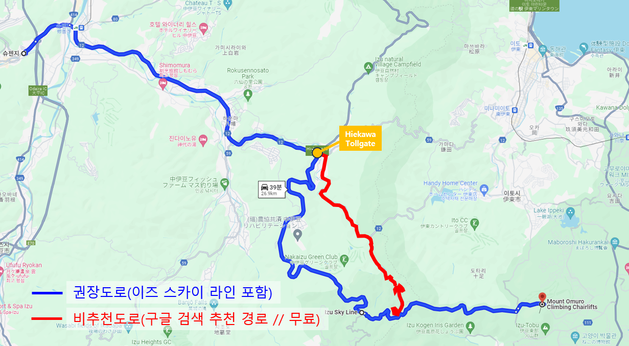 슈젠지에서 Hiekawa IC까지 가는 길은 동일한데, 이 IC에서 반드시 유료도로(이즈 스카이 라인)를 이용하는 게 좋습니다. 그렇지 않으면 구불구불한 산길(112번 도로)을 타고 15분 정도를 계속 올라가야 하는데,커브도 많은 데다가 상당히 좁고 가드레일이 없는 구간이 있습니다.