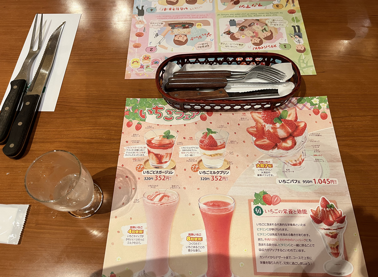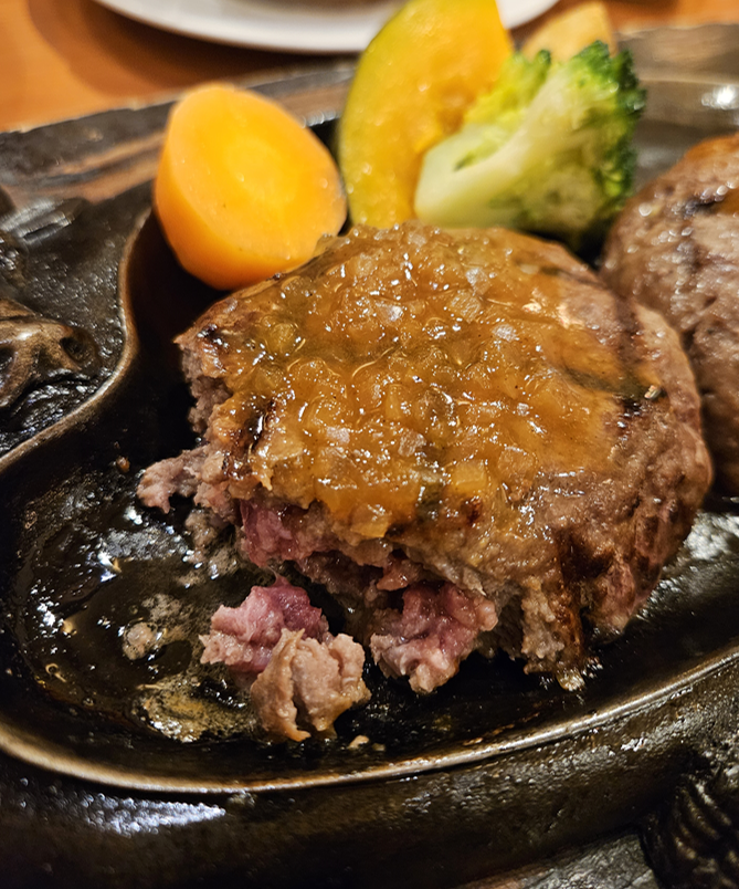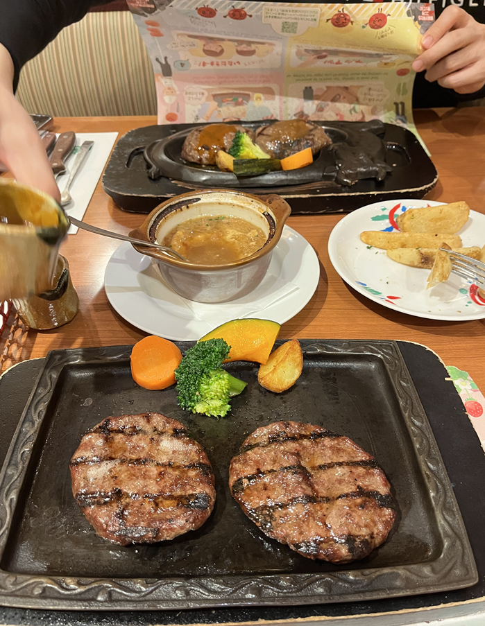 메뉴는 대표 메뉴인 함박스테이크를 두 개 시키고, 맛있다고 들었던 어니언 수프, 감자튀김, 그리고 시즈오카 딸기로 만든 딸기 주스를 시켰습니다. 함박스테이크는 두 가지 사이즈가 있었는데 하나는 보통으로, 하나는 큰 사이즈로 했습니다.