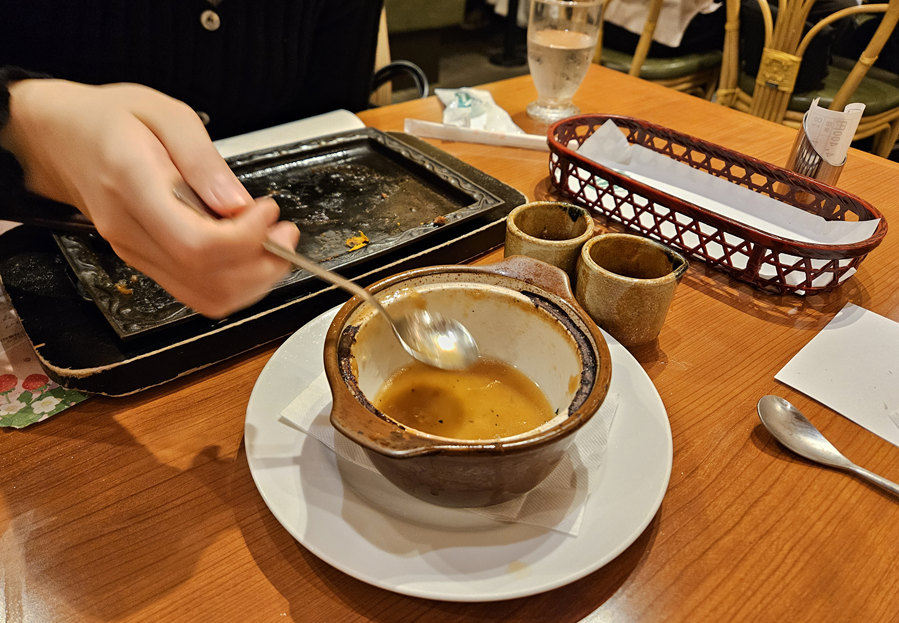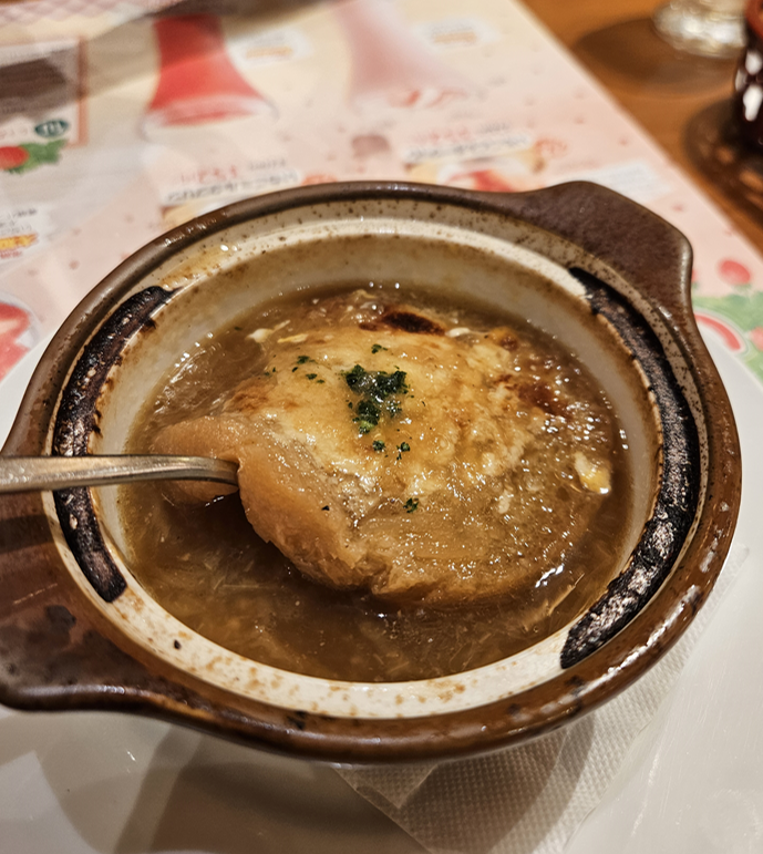 먼저 어니언 수프가 나왔는데, 단짠단짠하니 맛있었습니다. 하나만 시켜서 아쉬웠네요.