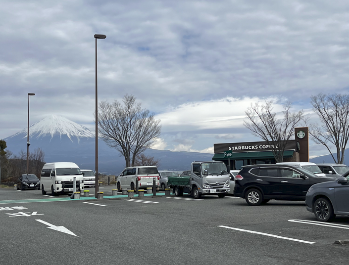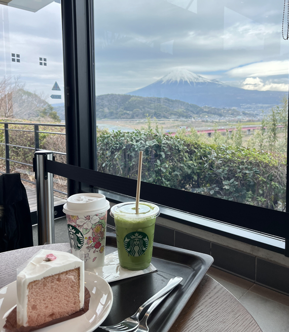 우여곡절 끝에 SA(휴게소)로 들어오면 스타벅스와 그 뒤로 보이는 후지산 풍경이 반갑게 맞아줍니다. 스타벅스 이외에도 음식과 음료를 파는 판매점이 있었지만, 스타벅스로 곧장 직진해서 음료와 케이크를 시키고 풍경을 즐겼습니다.