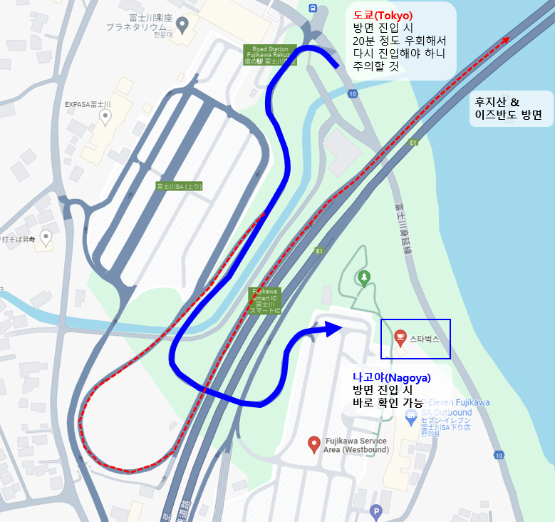 후지카와 라쿠자 SA는 E1로 명기되어 있는 도메이 고속도로(Tomei Expressway)의 나고야 방면에 있습니다. 후지카와(富士川)는 후지강을 뜻하며, SA는 Service Area의 준말로 후지강 근처의 휴게소로 생각하시면 되겠습니다. 도쿄 방면과 나고야 방면 모두 후지카와 라쿠자 SA가 있는데, 스타벅스가 있는 후지카와 라쿠자 SA는 나고야 방면에 있다는 사실을 꼭 숙지하셔야 합니다. 저희가 처음에 여기를 들리려고 했을 때, 나고야 방면이 아닌 도쿄 방면으로 진입하여(...) 돌아가느라 20분을 추가로 손해 봤습니다. 국도에서는 'Road Station'이라 명명된 국도의 후지카와 라쿠자 휴게소도 있는데, 여기서 고속도로로 진입 후 나고야 방면으로 운행하면 바로 후지카와 라쿠자 SA 스타벅스를 만날 수 있습니다.