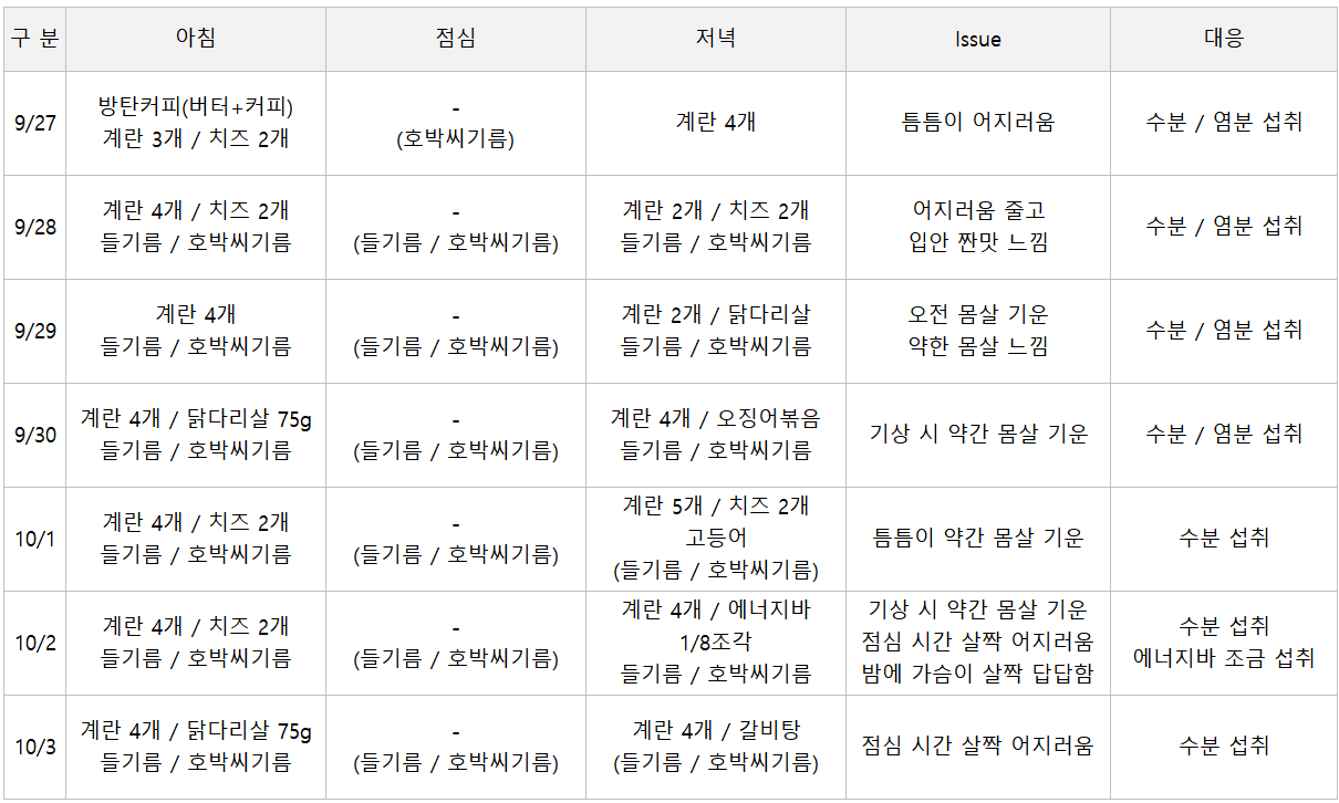 - 작성된 식단 이외에도 김치, 샐러드와 같이 최대한 탄수화물을 배제한 반찬을 곁들였습니다.