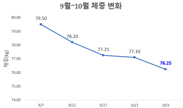 식습관을 바꾸지 않은 상태에서 운동만 조금 하는 걸로는 체중 변화가 눈에 보이지 않았는데요. 식단을 바꾸고 난 이후에는 격렬한 운동을 하지 않았음에도 불구하고 2주간 체중이 지속 줄어들고 눈으로도 몸의 변화를 알 수 있었습니다. 직장 동료들이 살이 많이 빠지고 얼굴이 좋아졌다고 하는 걸 보면 효과는 확실한 것으로 보입니다. 한 달 동안 대략 3kg의 체중을 감량할 수 있었습니다.